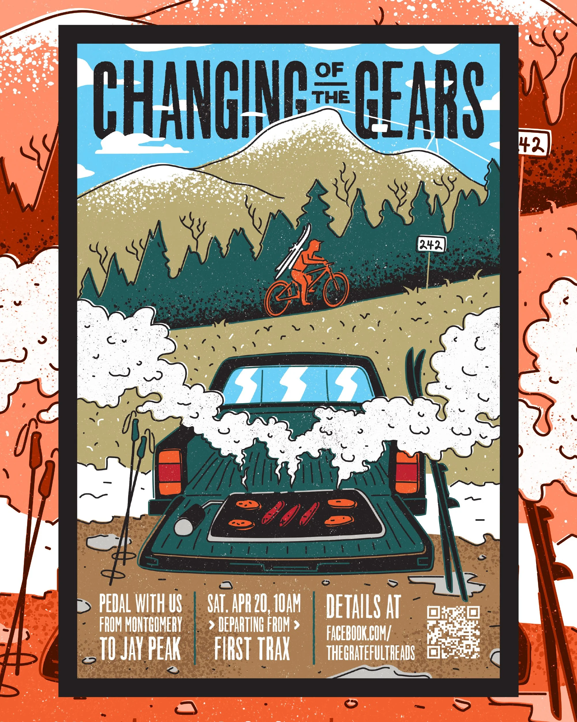 Event poster and digital assets for the 2024 Changing of the Gears ride and afterparty, put on by the Grateful Treads nonprofit in Northern Vermont